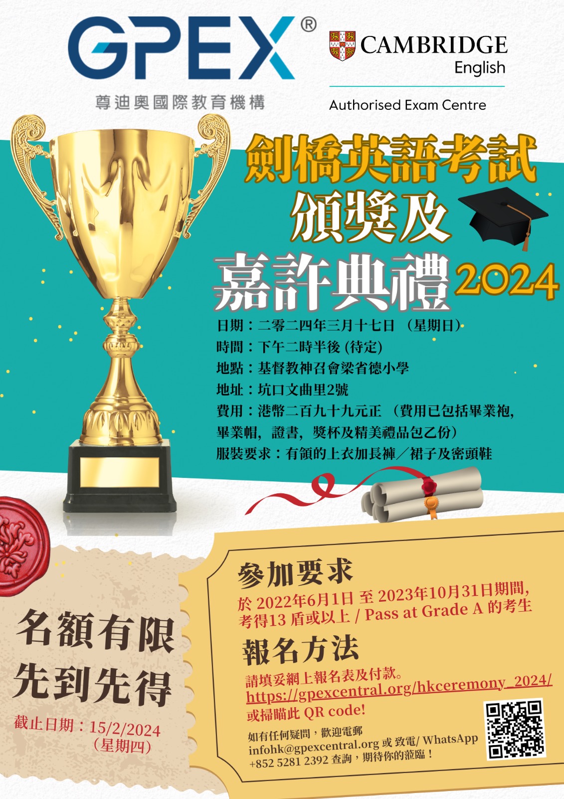 為嘉許您的孩子在劍橋英語考試中取得卓越的成績(13盾或以上 或 Pass at Grade A),我們誠邀您和您的孩子一同參加本機構舉辦的頒獎及嘉許典禮,每位孩子最多可由兩位家長陪同出席。
